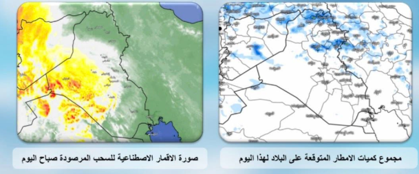 غائم جزئي يتحول الى غائم على فترات . وهطول زخات مطر خفيفة الى معتدلة خلال ساعات الصباح في الأقسام الغربية للبلاد تمتد لاحقا لتشمل أماكن متفرقة من المنطقتين الوسطى والشمالية.