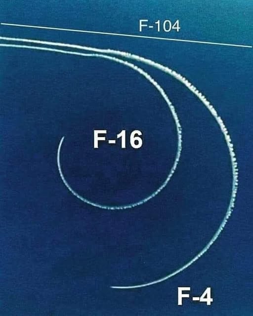 تُختزل هذه اللوحة الفيزيائية الفارق الجوهري في "هندسة المناورة" بين ثلاثة أجيال من المقاتلات، حيث يبرز التباين الحاد في نصف قطر الالتفاف (Turning Radius) كمعيار حاسم في التفوق الجوي؛ فنلاحظ أن الطائرة F-104، المصممة كصاروخ مأهول للسرعة الخارقة، تفتقر للمرونة في المنعطفات الحادة، بينما تأتي F-4 بمسار متوسط يعكس صراع القوة والوزن. وفي المقابل، تبرز F-16 كأيقونة للمناورة القريبة بفضل انخفاض "تحميل الجناح" ونظام التحكم الإلكتروني، مما يتيح لها الالتفاف في أضيق دائرة ممكنة تحت ضغط جاذبية هائل .