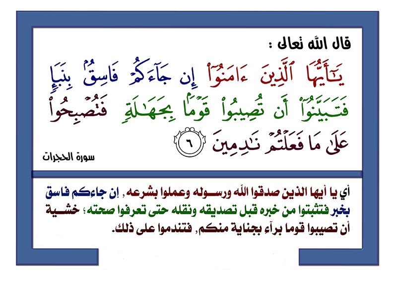 قال تعالى : {يَا أَيُّهَا الَّذِينَ آمَنُوا إِن جَاءَكُمْ فَاسِقٌ بِنَبَإٍ فَتَبَيَّنُوا أَن تُصِيبُوا قَوْمًا بِجَهَالَةٍ فَتُصْبِحُوا عَلَىٰ مَا فَعَلْتُمْ نَادِمِينَ} [الحجرات : 6] .