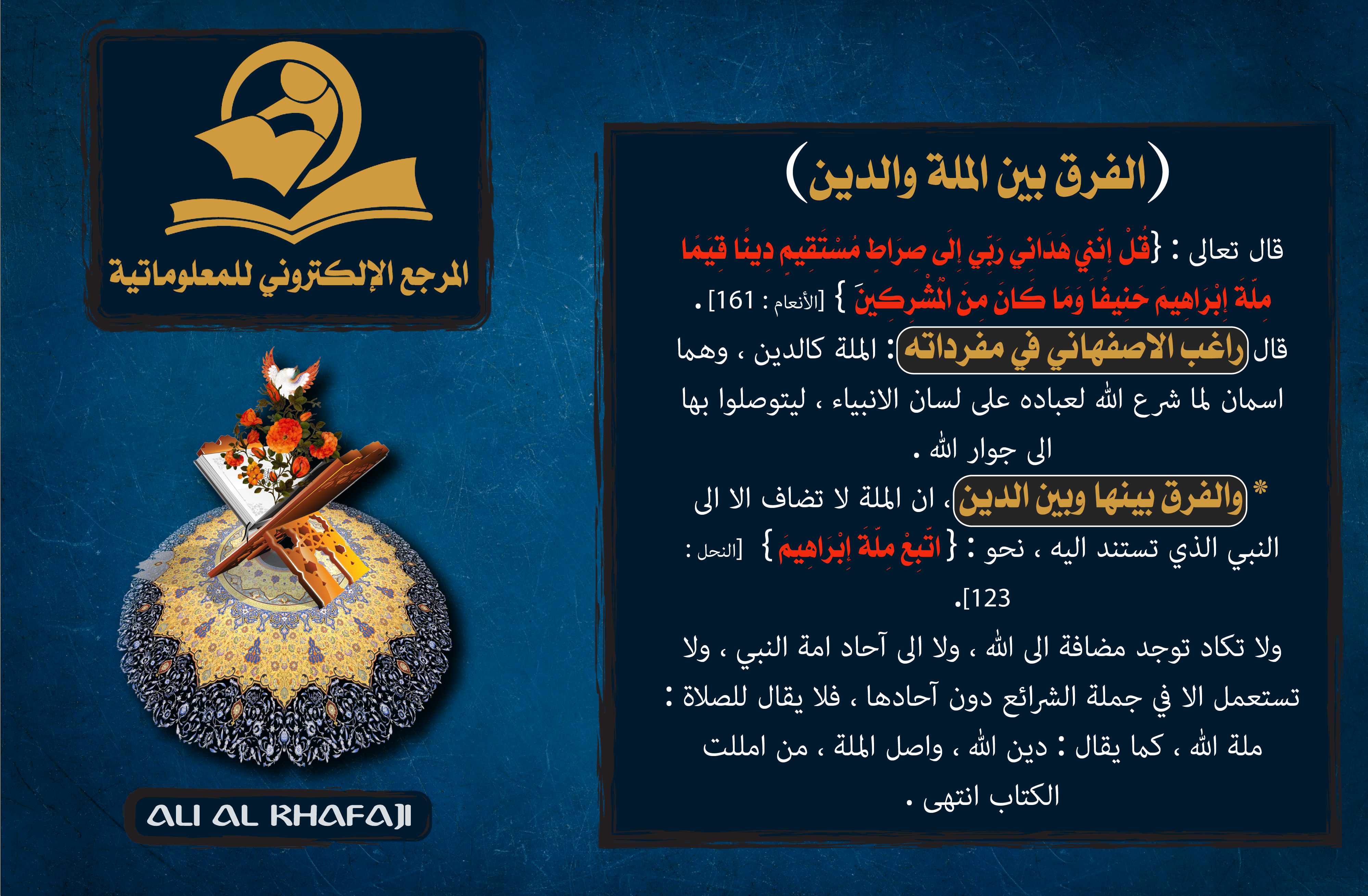 الفرق بين الملة والدين : قال تعالى : {قُلْ إِنَّنِي هَدَانِي رَبِّي إِلَى صِرَاطٍ مُسْتَقِيمٍ دِينًا قِيَمًا مِلَّةَ إِبْرَاهِيمَ حَنِيفًا وَمَا كَانَ مِنَ الْمُشْرِكِينَ } [الأنعام : 161] .