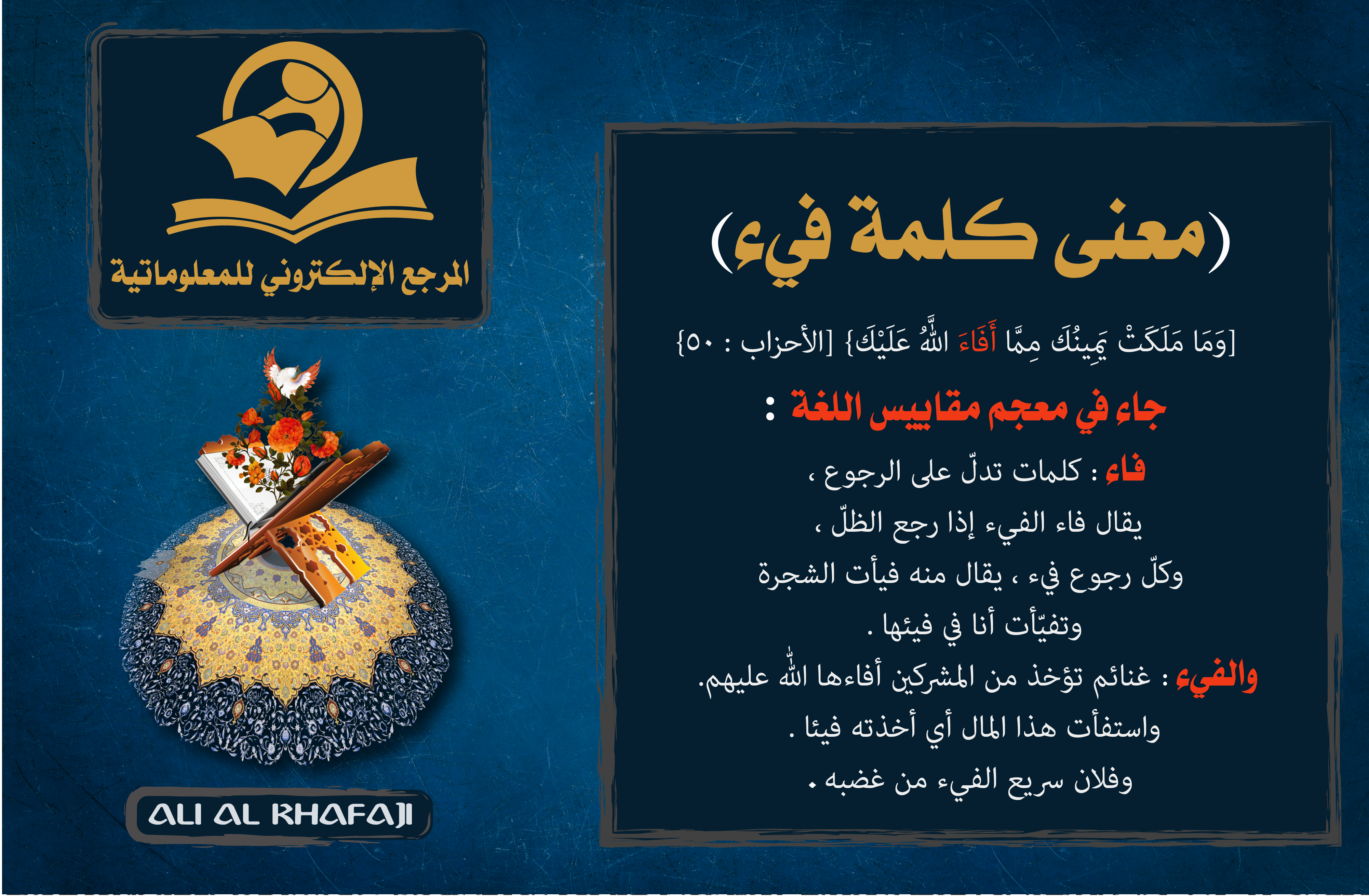 فاء : كلمات تدلّ على الرجوع ، يقال فاء الفي‌ء إذا رجع الظلّ ، وكلّ رجوع في‌ء ، يقال منه فيأت الشجرة