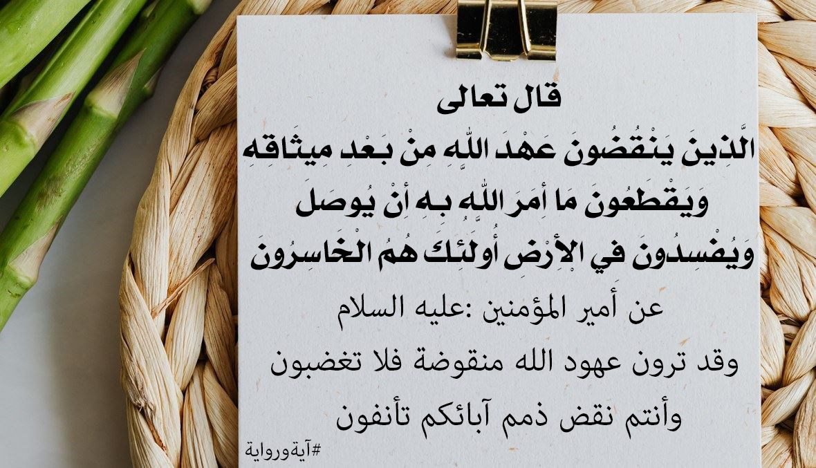 عن أمير المؤمنين (عليه السلام) : «وقد ترون عهود الله منقوضة فلا تغضبون، وأنتم نقض ذمم آبائكم تأنفون!».
