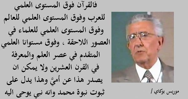 موريس بوكاي ( ت 1998)، طبيب فرنسي ونشأ على المسيحية الكاثوليكية، وبعد دراسة للكتب المقدسة عند اليهود والمسلمين أسلم وألف كتاب التوراة والأناجيل والقران الكريم بمقياس العلم الحديث . من أشهر مقولاته: "فالقرآن فوق المستوى العلمي للعرب، وفوق المستوى العلمي للعالم، وفوق المستوى العلمي للعلماء في العصور اللاحقة، وفوق مستوانا العلمي المتقدم في عصر العلم والمعرفة في القرن العشرين ولا يمكن ان يصدر هذا عن أميَّ وهذا يدل على ثبوت نبوة محمد وانه نبي يوحى اليه".