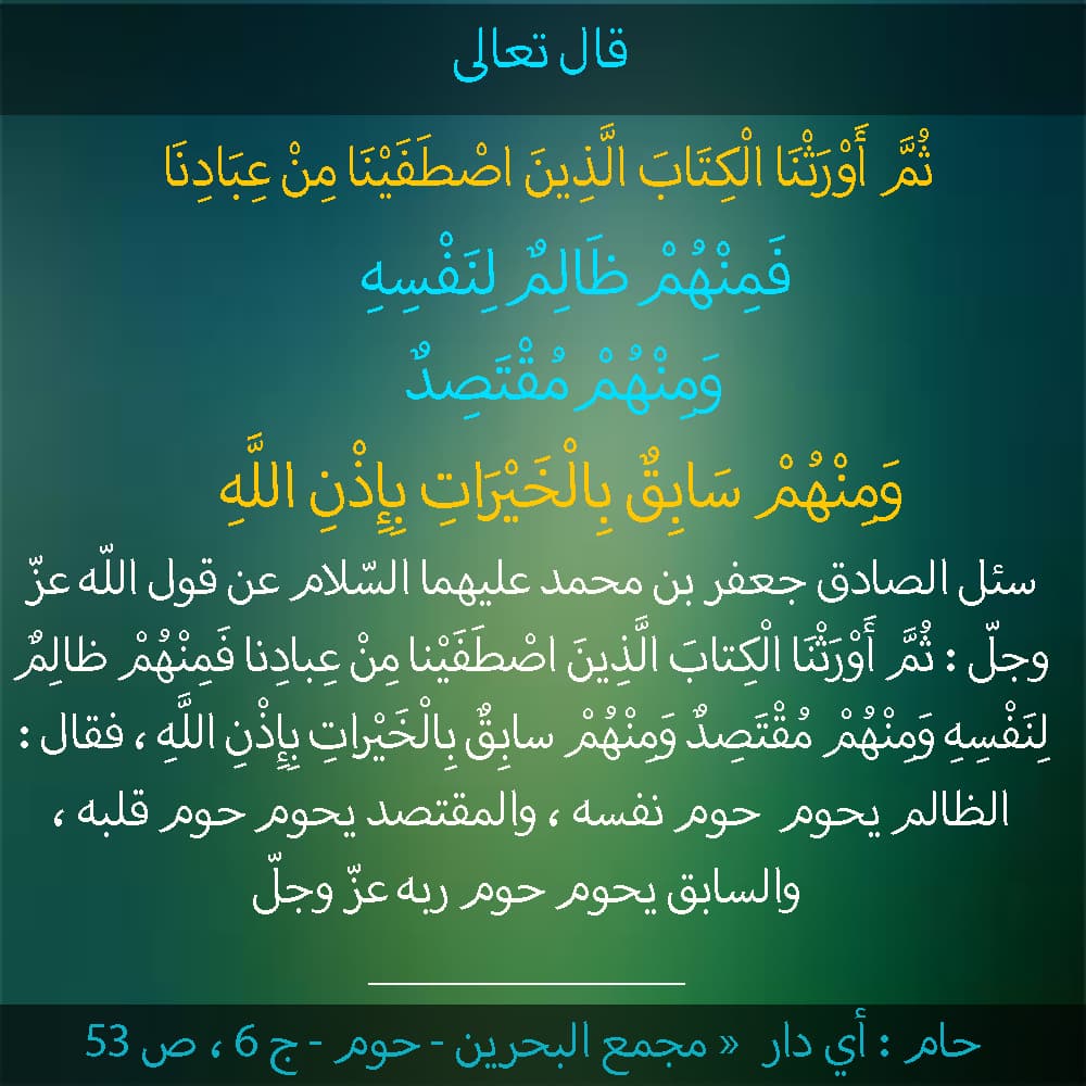 قال تعالى : {ثُمَّ أَوْرَثْنَا الْكِتَابَ الَّذِينَ اصْطَفَيْنَا مِنْ عِبَادِنَا فَمِنْهُمْ ظَالِمٌ لِنَفْسِهِ وَمِنْهُمْ مُقْتَصِدٌ وَمِنْهُمْ سَابِقٌ بِالْخَيْرَاتِ بِإِذْنِ اللَّهِ ذَلِكَ هُوَ الْفَضْلُ الْكَبِيرُ } [فاطر: 32]