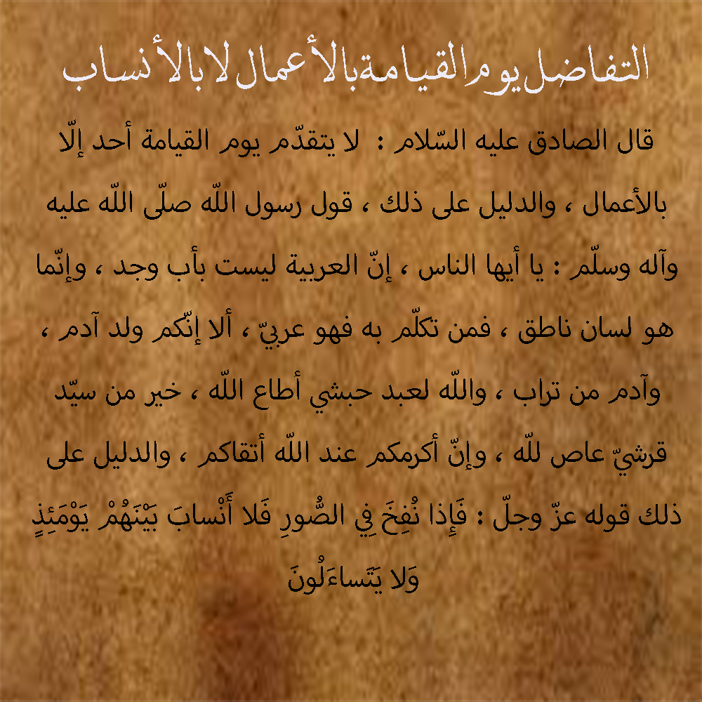 قال الصادق عليه السّلام : « لا يتقدّم يوم القيامة أحد إلّا بالأعمال ، والدليل على ذلك ، قول رسول اللّه صلّى اللّه عليه وآله وسلّم : يا أيها الناس ، إنّ العربية ليست بأب وجد ، وإنّما هو لسان ناطق ، فمن تكلّم به فهو عربيّ ، ألا إنّكم ولد آدم ، وآدم من تراب ، واللّه لعبد حبشي أطاع اللّه ، خير من سيّد قرشيّ عاص للّه ، وإنّ أكرمكم عند اللّه أتقاكم ، والدليل على ذلك قوله عزّ وجلّ : فَإِذا نُفِخَ فِي الصُّورِ فَلا أَنْسابَ بَيْنَهُمْ يَوْمَئِذٍ وَلا…