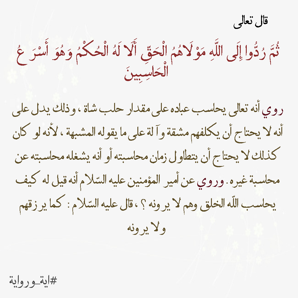 قال تعالى : {ثُمَّ رُدُّوا إِلَى اللَّهِ مَوْلَاهُمُ الْحَقِّ أَلَا لَهُ الْحُكْمُ وَهُوَ أَسْرَعُ الْحَاسِبِينَ} [الأنعام: 62].
