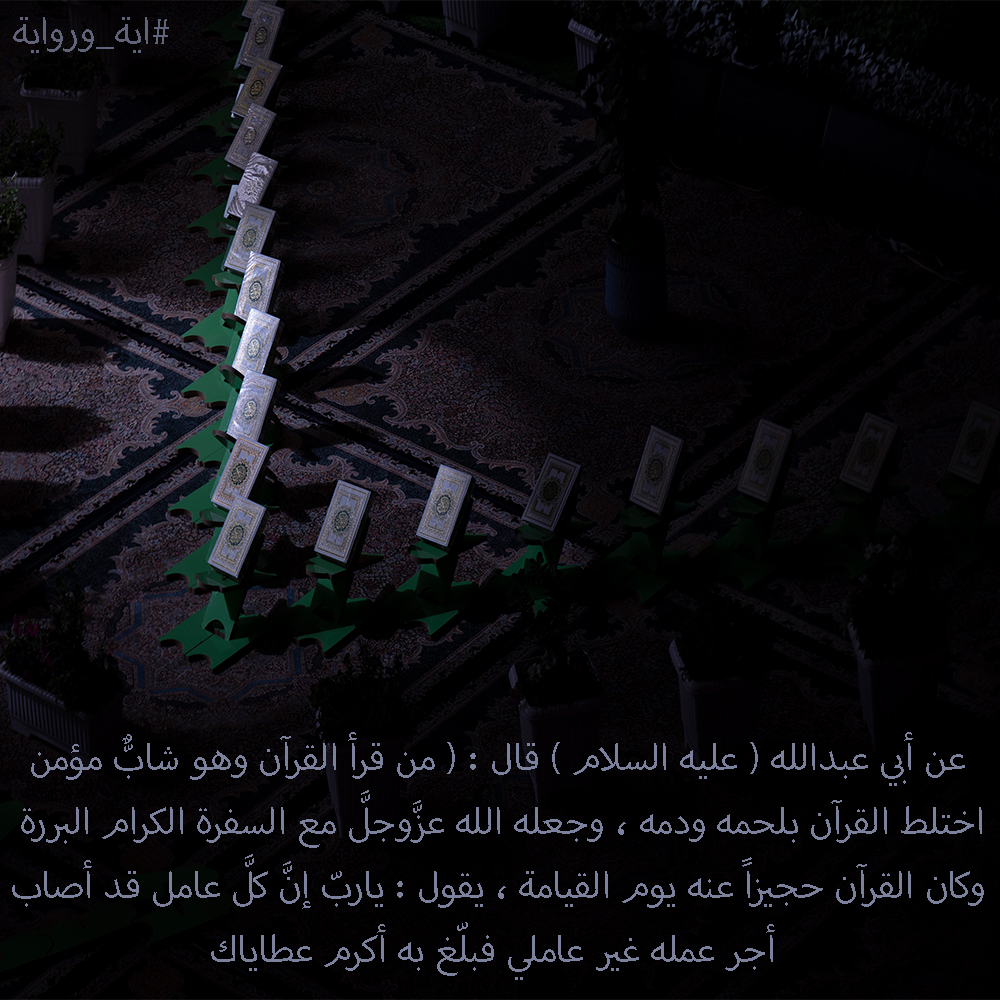 عن أبي عبدالله ( عليه السلام ) قال : ( من قرأ القرآن وهو شابٌّ مؤمن اختلط القرآن بلحمه ودمه ، وجعله الله عزَّوجلَّ مع السفرة الكرام البررة ، وكان القرآن حجيزاً عنه يوم القيامة ، يقول : ياربّ إنَّ كلَّ عامل قد أصاب أجر عمله غير عاملي فبلّغ به أكرم عطاياك.