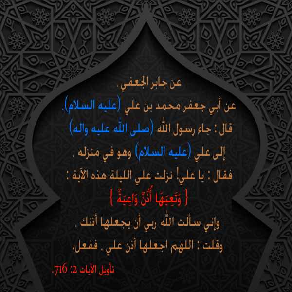عن جابر الجعفي ، عن أبي جعفر محمد بن علي (عليه السلام)، قال : جاء رسول الله (صلى الله عليه واله) إلى علي (عليه السلام) وهو في منزله ، فقال : يا علي! نزلت علي الليلة هذه الآية : { وَتَعِيَهَا أُذُنٌ وَاعِيَةٌ } وإني سألت الله ربي أن يجعلها أذنك ، وقلت : اللهم اجعلها أذن علي ، ففعل(1)