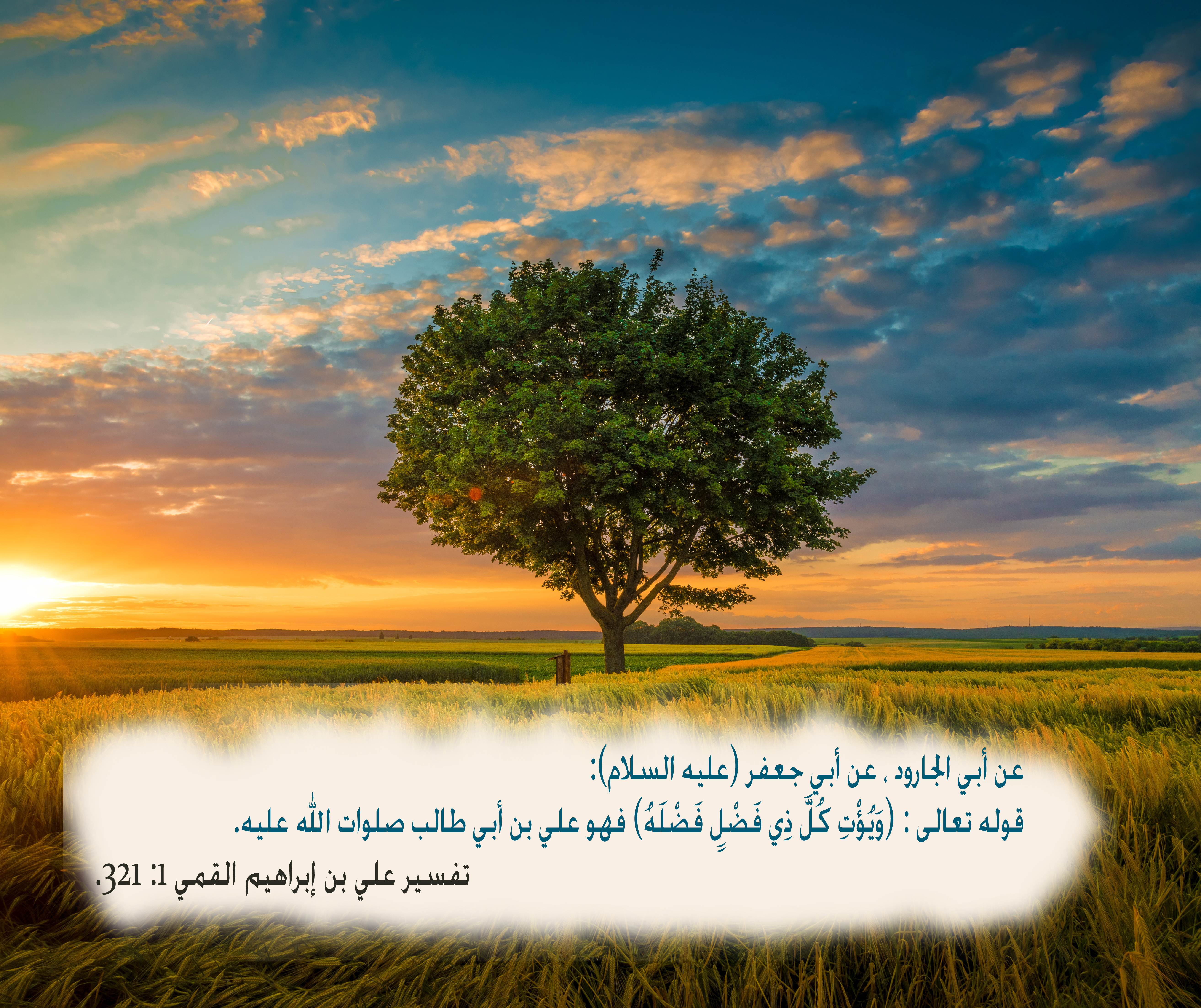 عن أبي الجارود ، عن أبي جعفر (عليه السلام): قوله تعالى : (وَيُؤْتِ كُلَّ ذِي فَضْلٍ فَضْلَهُ) فهو علي بن أبي طالب صلوات الله عليه