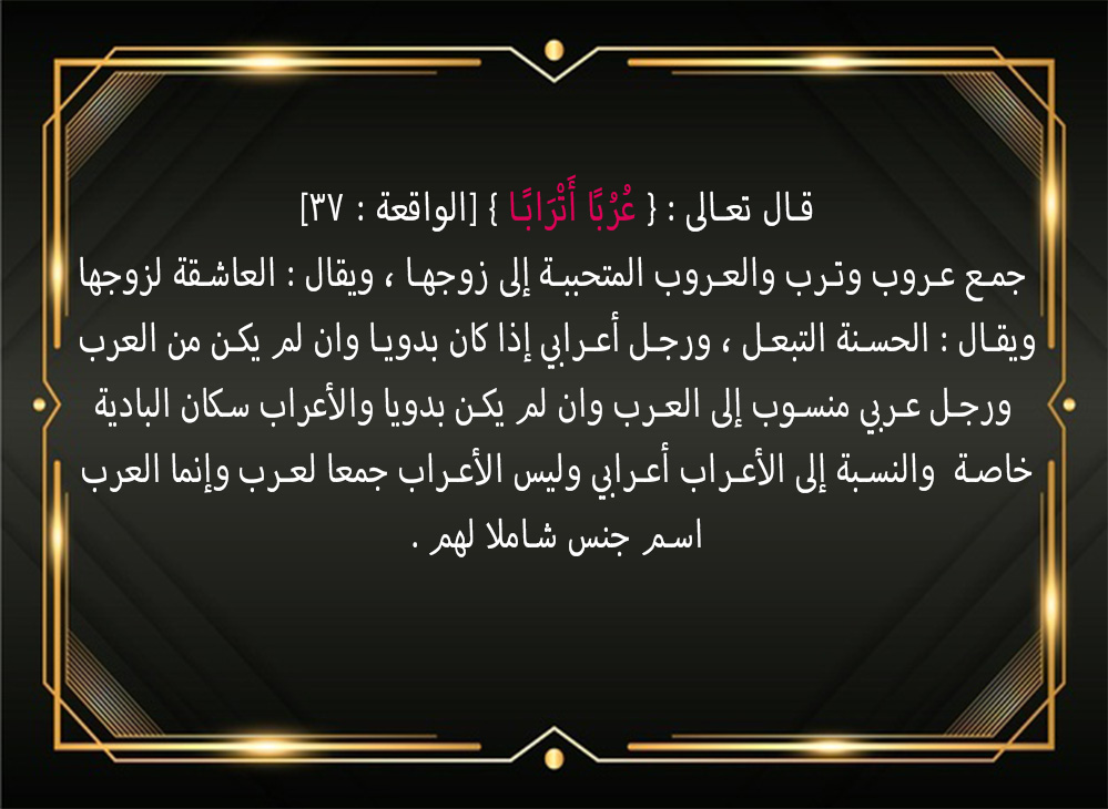 قال تعالى : { عُرُبًا أَتْرَابًا } [الواقعة : 37] جمع عروب وترب والعروب المتحببة إلى زوجها ، ويقال : العاشقة لزوجها ، ويقال : الحسنة التبعل ، ورجل أعرابي إذا كان بدويا وان لم يكن من العرب ، ورجل عربي منسوب إلى العرب وان لم يكن بدويا والأعراب سكان البادية خاصة والنسبة إلى الأعراب أعرابي وليس الأعراب جمعا لعرب وإنما العرب اسم جنس شاملا لهم .