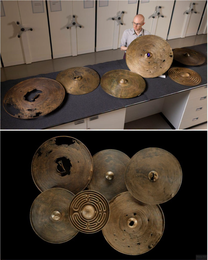 تعرض الصورة مجموعة نادرة من ستة دروع من العصر البرونزي المعروفة باسم دروع من نوع يثولم، يعود تاريخها إلى 3,300 إلى 3,500 عام.