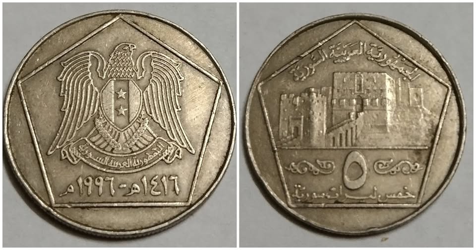 تُجسّد هذه العملة المعدنية فئة الخمس ليرات من الجمهورية العربية السورية مرحلةً مهمة من تاريخ النقد في البلاد خلال تسعينيات القرن العشرين. صدرت العملة عام 1996 (1416هـ)، وتحمل على أحد وجهيها شعار الدولة المتمثل بالنسر، في إشارة إلى السيادة والهوية الوطنية، بينما يُظهر الوجه الآخر رسماً لقلعة تاريخية تعكس عمق التراث العمراني السوري.
