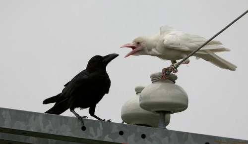 معظم الناس يعتقدون ان الغربان سوداء اللون فقط ، ولكن هناك عدد من الأنواع من جنس كورفوس ، فقد تكون بيضاء بالكامل او بيضاء الريش. الغربان الامريكية كورفوس تظهر بيضاء في كثير من الاحيان حيث ما يقرب من 1٪ من الطيور الصغيرة الاميركية تظهر بيضاء اللون .إذا كانت المشكلة الأساسية أكثر (على سبيل المثال، طفرة جينية) يمكن أن يتأثر الطائر بأكمله. ويمكن لبعض الغربان ان تكون بيضاء اللون تماما .