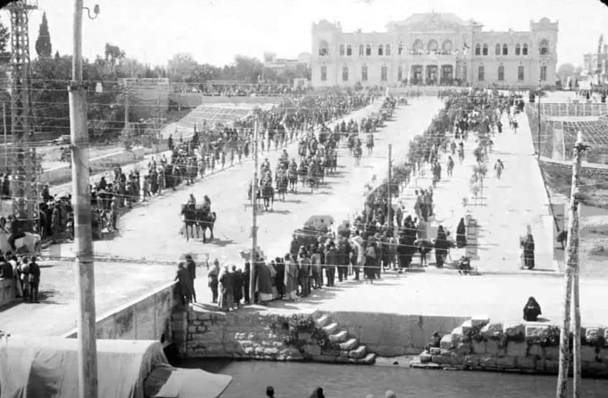 عرض عسكري أمام المحطة، ونرى بوضوح عدم وجود أي بناء أو مظهر عمراني في الشارع الواصل بين مدخل المحطة وجسر فيكتوريا الذي يظهر جزء منه، يلفتنا أيضاً الدرج الحجري الذي يؤمن الوصولية لمجرى النهر حيث كانت تستخدم فيه القوارب للتنقل والتنزه.
