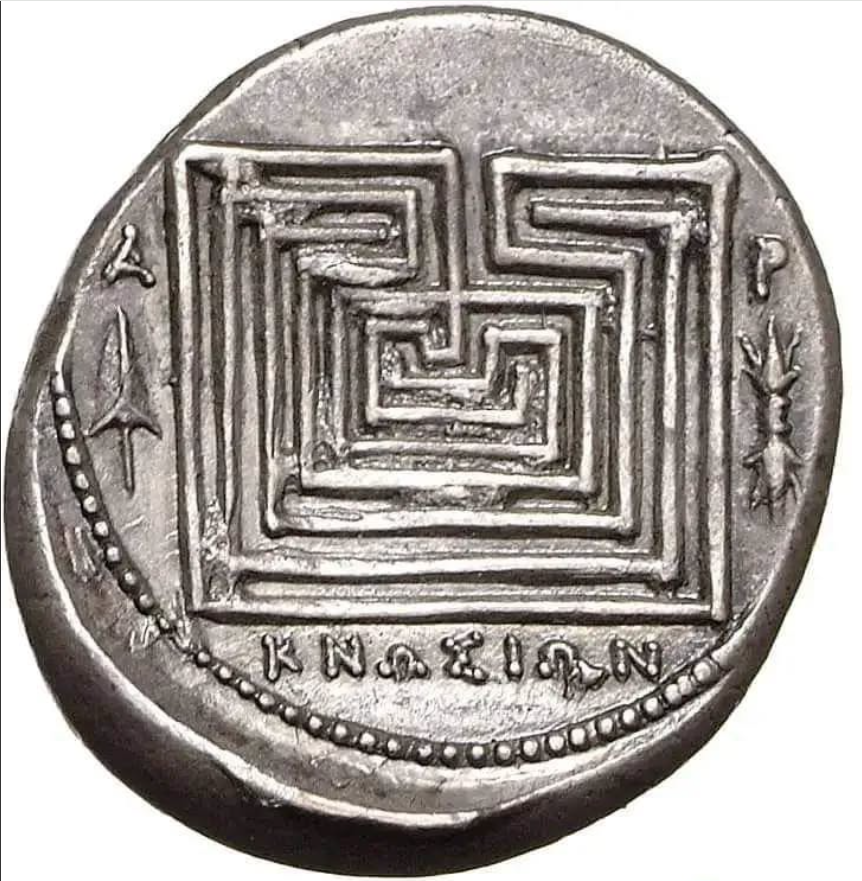عملةٌ يونانيةٌ قديمة من كنوسوس، تُصوِّر المتاهة الأسطورية في كنوسوس بجزيرة كريت، التي قيل إنّها كانت تأوي المينوتور، ذلك الكائن الأسطوري الكريتي ذو جسد الإنسان ورأس الثور.