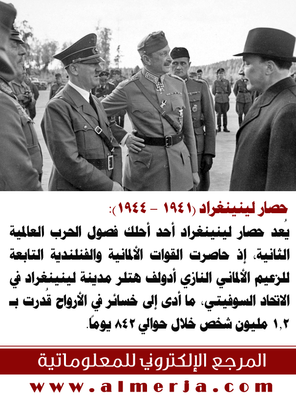 يُعد حصار لينينغراد أحد أحلك فصول الحرب العالمية الثانية، إذ حاصرت القوات الألمانية والفنلندية التابعة للزعيم الألماني النازي أدولف هتلر مدينة لينينغراد في الاتحاد السوفيتي، ما أدى إلى خسائر في الأرواح قُدرت بـ 1.2 مليون شخص خلال حوالي 842 يوماً.
