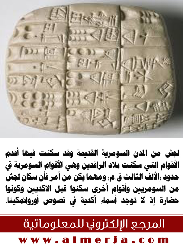 لجش من المدن السومرية القديمة وقد سكنت فيها أقدم الأقوام التي سكنت بلاد الرافدين وهي الأقوام السومرية في حدود (الألف الثالث ق.م) ومهما يكن من أمر فأن سكان لجش من السومريين وأقوام أخرى سكنوا قبل الاكديين وكونوا حضارة إذ لا توجد أسماء أكدية في نصوص أوروانمكينا.