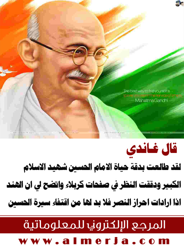 موهانداس غاندي(2 أكتوبر1869- 30 يناير1948) السياسي والزعيم الروحي للهند خلال حركة استقلال الهند. كان رائداً للساتياغراها وهي مقاومة الاستبداد من خلال العصيان المدني الشامل تأسست بقوة عقب أهمسا أو اللاعنف الكامل والتي أدت إلى استقلال الهند وألهمت حركات الحقوق المدنية والحرية في جميع أنحاء العالم. غاندي معروف في جميع أنحاء العالم باسم المهاتما غاندي المهاتما أي الروح العظيمة تم تشريفه رسمياً في الهند باعتباره أبو الأمة حيث أن عيد ميلاده يتم الاحتفال به هناك كـغاندي وهو عطلة وطنية وعالمية.