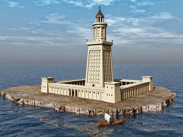 منارة الإسكندرية: بناها المهندس سوستراتوس بعهد الملك بطليموس الثاني حوالى 285-246 ق م في جزيرة فاروس بالإسكندرية مصنوعة من الرُّخام الصلب الابيض كانت ترشد أساطيل السفن البحرية في الليل عبر نورها الساطع الذي كان يبدو من مسافةٍ كبيرةٍ تقدر بعشرةِ فراسخ بحرية تُعتبر هذه المنارة تُحفةً معماريةً فنيةً رائعة وقد تم تصنيفها من ضمن عجائب الدنيا السبع وذلك على اعتبار أنّها أطول صرح أو بناء على سطح الكرة الأرضية حيث كان يبلغ طولها آنذاك مئةً وسبعة عشر متراً، واليوم لم تبقَ منها إلاَّ أجزاء قليلة.