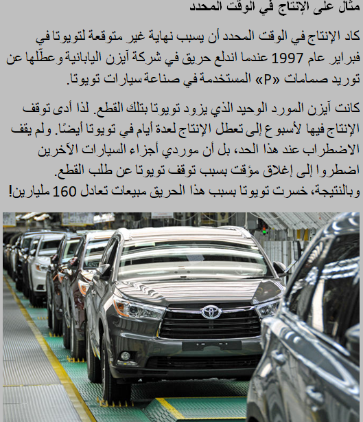 نُورد المثال اعلاه لتوضيح نتائج وآثار تطبيق شركة تويوتا لنظام الانتاج في الوقت المحدد .