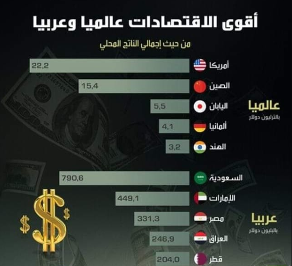 عالميا احتلت #الولايات_المتحدة المرتبة #الأولى بناتج محلي قدره 22.2 تريليون دولار سنويا وتعد الولايات المتحدة أكبر اقتصاد في العالم منذ عام 1871. احتلت #جمهورية_الصين بالمرتبة #الثانية بناتج محلي قدره 15.4 تريليون دولار. الصين شهدت معدل نمو اقتصادي قدره 9.52 % بين عامي 1989 و 2019 وهو رقم تاريخي لم يسبق لاي دولة ان حققته بهذه السرعة والقوة.