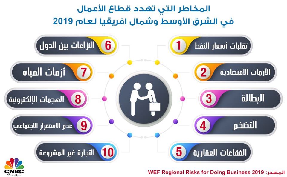 ابرز المخاطر التي تهدد قطاع الأعمال في الشرق الأوسط وشمال افريقيا لعام 2019 المنصرم : الأزمات الاقتصادية ، عدم الاستقرار السياسي ، البطالـة ، التضخم ، الفساد الاداري والمالي ، النزاعات بين الدول ، تقلبات أسعار النفط ..