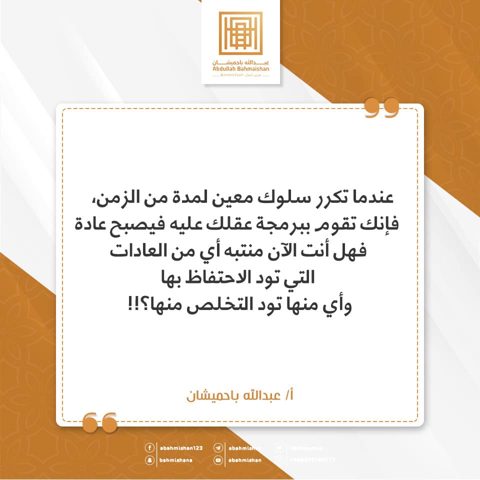 عندما تكرر سلوك معين لمدة من الزمن ، فإنك تقوم ببرمجة عقلك عليه فيصبح عادة ؛ فهل أنت الآن منتبه أي من العادات التي تود الاحتفاظ بها وأي منها تود التخلص منعا ؟؟!! ... عبد الله باحميشان .