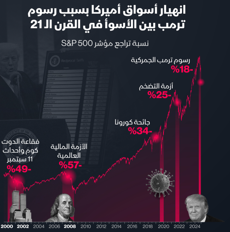 رسوم ترامب الجمركية تدفع أسواق #الأسهم_الأميركية لتسجيل واحد من أكبر الانهيارات التي شهدتها في القرن 21 .