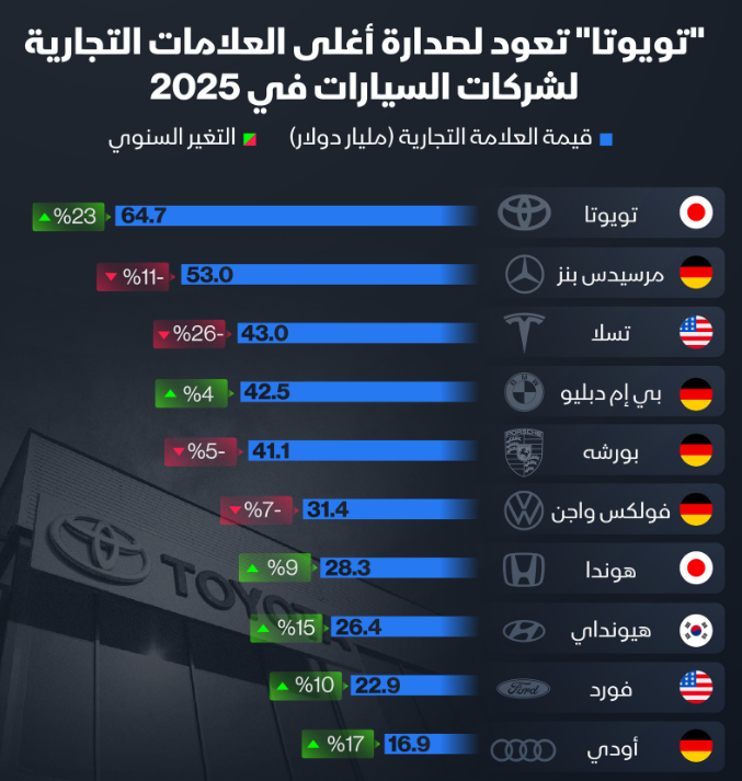 "تويوتا" تتصدر أغلى العلامات التجارية لشركات #السيارات عالميا لعام 2025، متفوقة على مرسيدس بنز و #تسلا..