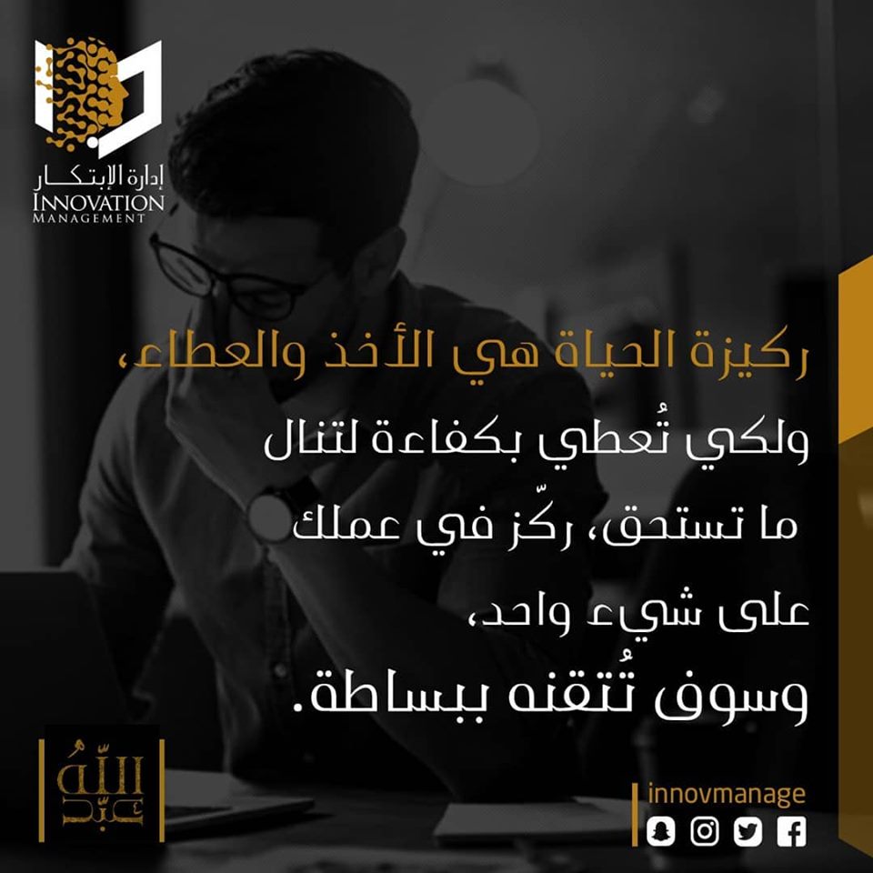 ركيزة الحياة هي الأخذ والعطاء ، ولكي تعطي بكفاءة لتنال ما تستحـق ، ركز في عملك على شيء واحـد ، وسوف تتقنـه ببساطـة .