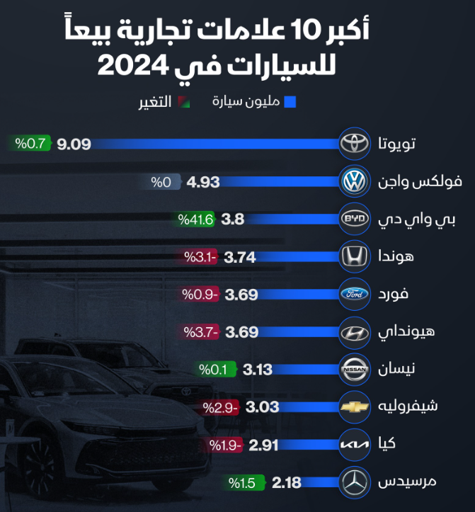 رغم تباطؤ مبيعات شركة السيارات اليابانية #تويوتا، إلا أنها جاءت في مقدمة العلامات التجارية الأكثر مبيعا العام الماضي بأكثر من 9 ملايين سيارة . -شركة BYD الصينية التي ارتفعت مبيعاتها العالمية 41%، فرضت وجودها داخل التصنيف وصعدت 6 مراكز لتحتل المركز الثالث بنحو 3.8 مليون سيارة .