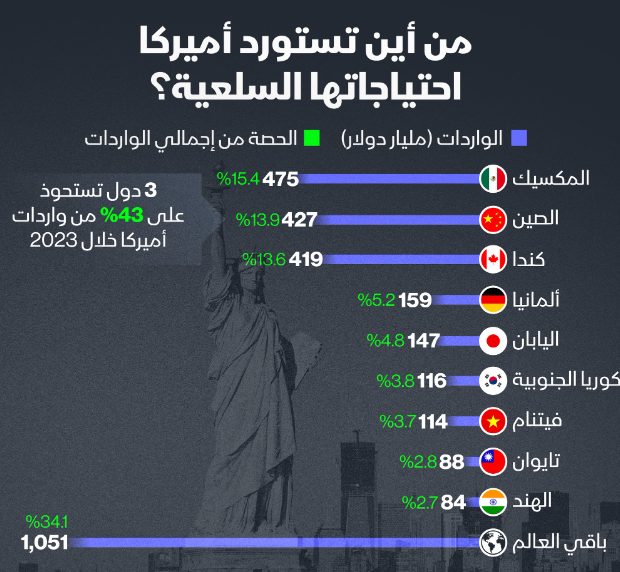 المكسيك و الصين و كندا استحوذوا على 43% من واردات أميركا السلعية العام الماضي...تعرّف على باقي الدول التي تـسـد احتياجات الولايات المتحدة .