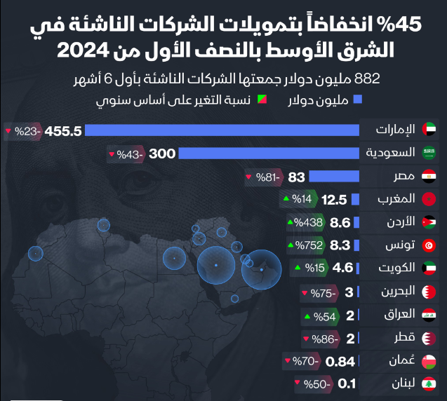 التمويلات التي حصلت عليها الشركات الناشئة في منطقة #الشرق_الأوسط تراجعت إلى 882 مليون دولار خلال النصف الأول من 2024 بانخفاض نسبته 45% على أساس سنوي.. والتمويلات شهدت قفزة في كل من تونس والاردن والعراق .
