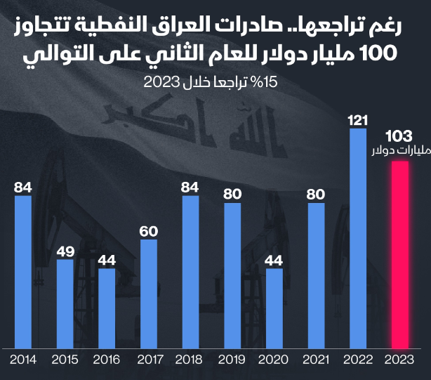 صادرات #العراق النفطية تتراجع في 2023 بنسبة 15%، لكنها تجاوزت 100 مليار دولار للعام الثاني على التوالي، بحسب بيانات "أوبك"
