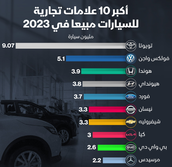 #تويوتا تتصدر قائمة الشركات الأكثر مبيعاً للسيارات في 2023، بفارق كبير عن #فولكس_واجن التي احتلت المرتبة الثانية