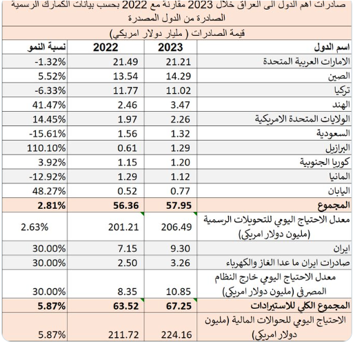 صادرات الدول الاخرى غير المذكورة الى العراق تبلغ ما قيمته 3-5 مليار دولار امريكي وعليه يكون مجمل صادرات الدول الى العراق في 2023 ماقيمته 71 مليار دولار امريكي.