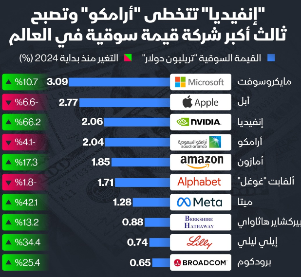 صانعة الرقائق الأميركية #إنفيديا تخطت "أرامكو" #السعودية لتصبح ثالث أكبر شركة في العالم من حيث القيمة السوقية..هذه أبرز التغيرات في قائمة أكبر عشر شركات فس العالم منذ بداية 2024.