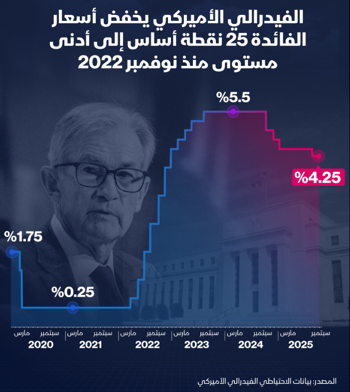لأول مرة منذ عودة ترامب.. الفيدرالي الأميركي يخفض أسعار الفائدة 25 نقطة أساس لتصل إلى نطاق بين 4 و4.25%.