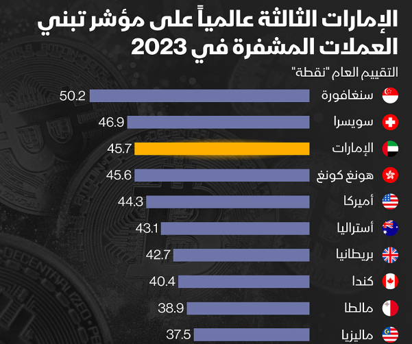 جاءت الإمارات في المرتبة الثالثة بين الدول الأكثر دعماً للعملات المشفرة في عام 2023، حيث حصدت 45.7 نقطة، بحسب "هينلي آند بارتنرز".