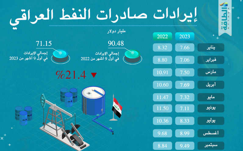 واصلت إيرادات صادرات النفط العراقي تراجعها على أساس سنوي خلال أول9 أشهر من العام الجاري (2023)،لتفقد نحو 19.33مليار دولار،متأثرة بتراجع سعر برميل النفط عند مقارنته بالمدة نفسها من2022.وتوضح بيانات رسمية،اطلعت عليها وحدة أبحاث الطاقة،أن إجمالي إيرادات العراق من صادرات النفط تراجع بنسبة21.4%إلى 71.15مليار دولار خلال المدة من يناير/كانون الثاني حتى نهاية سبتمبر/أيلول 2023،مقابل 90.48مليار دولار خلال المدة نفسها من العام الماضي(2022).سجل الربع الثالث من العام الجاري أفضل أداء لإيرادات على اساس فصلي.