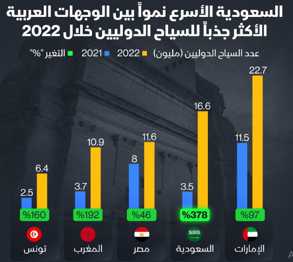 جاءت السعودية كأعلى الوجهات العربية نمواً في عدد السائحين الأجانب في عام 2022، إذ تخطى عددهم 16 مليوناً بمعدل نمو بلغ 378% عن العام السابق عليه، بحسب منظمة السياحة العالمية. ومن حيث أكثر البلدان العربية استقطاباً للسياح الأجانب في 2022، احتلت الإمارات الصدارة بأكثر من 22 مليون سائح أجنبي، وبارتفاع بـ97% عن 2021.
