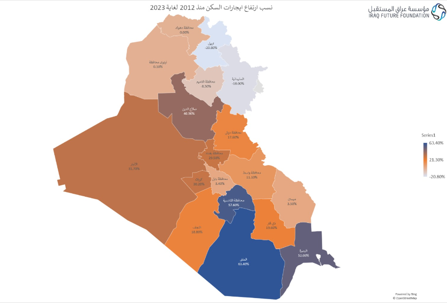 وارتفعت ايجارات السكن في بعض المحافظات لتتجاوز حاجز الـ ٥٠%. هذه الزيادة سببها غياب استراتيجية للاسكان وللاستثمار العقاري وتعد فشل كبير لسياسات الاستثمار وسياسات مبادرات الاسكان والتي لم تستطع تحقيق الهدف الاساس وهو توفير سكن باسعار مناسبة للمواطن العراقي.