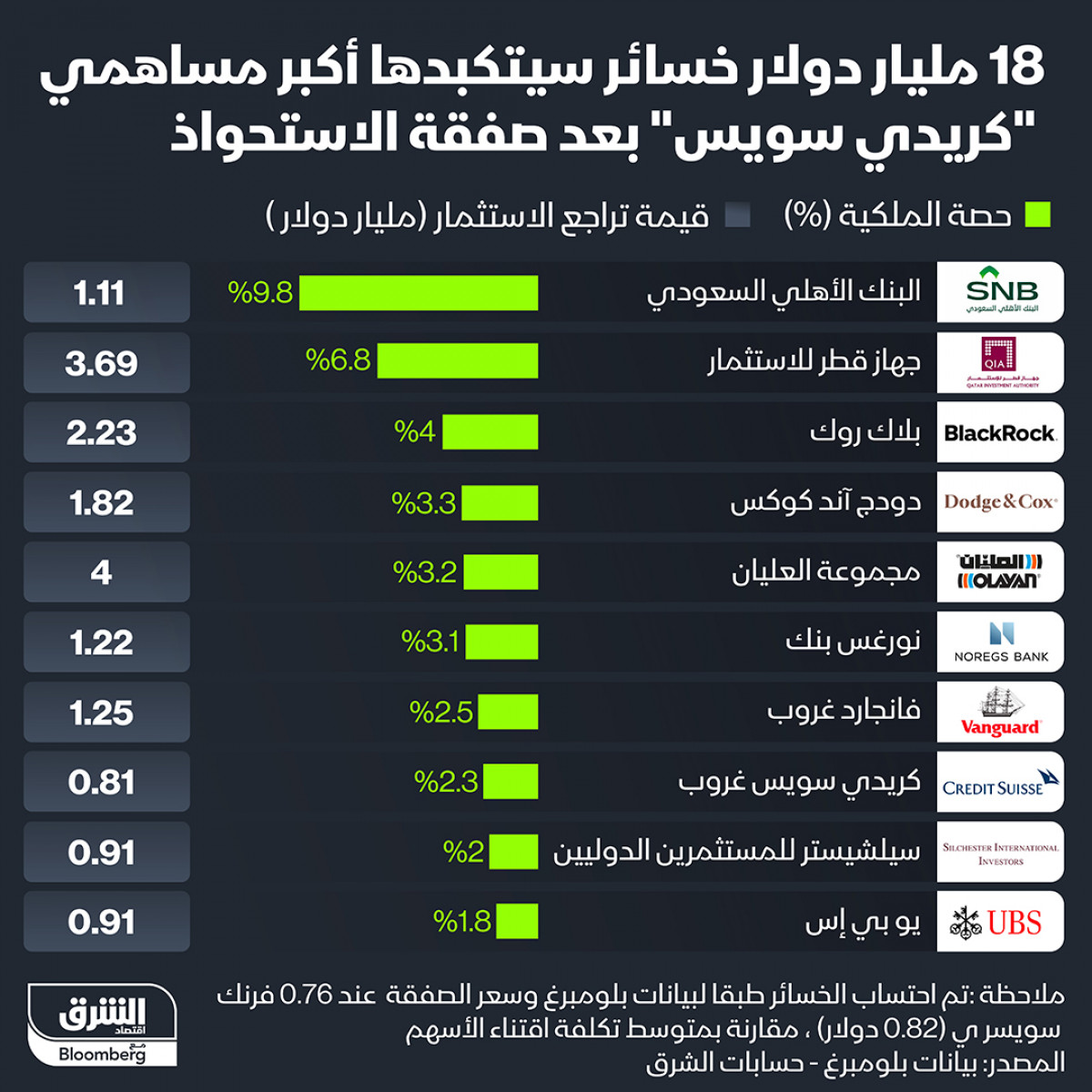 كبدت صفقة استحواذ بنك "يو بي إس" على منافسه السويسري الأصغر "كريدي سويس"، كبار المساهمين خسائر قُدرت بنحو 18 مليار دولار، وكان على رأس قائمة الخاسرين مجموعة "العليان" السعودية، بقيمة 4 مليارات دولار، كما كان "البنك الأهلي السعودي" و"جهاز قطر للاستثمار" أبرز الأسماء في تلك القائمة.