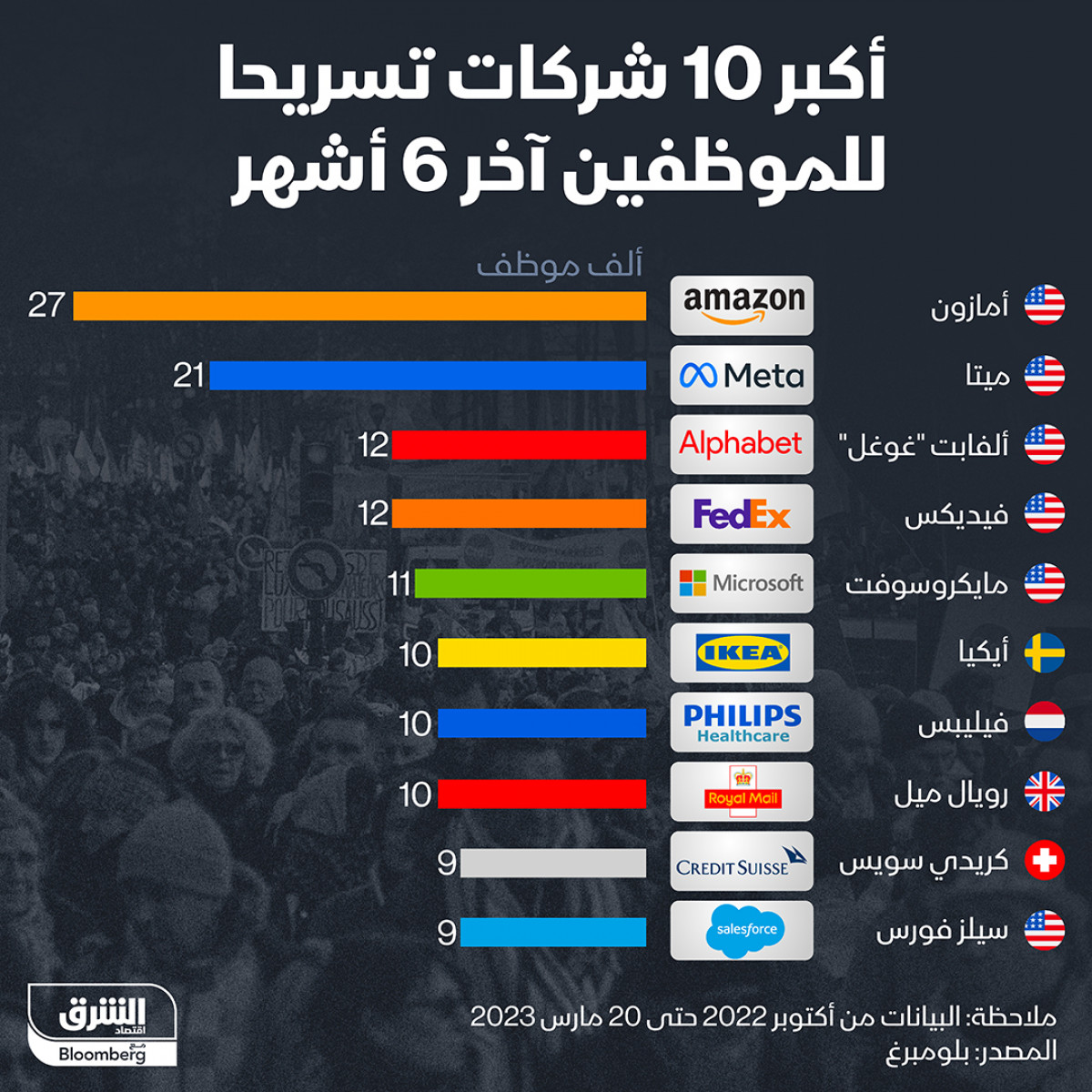 تصدّرت شركات التكنولوجيا قائمة أكبر المؤسسات التي قامت بتسريح موظفيها خلال آخر 6 أشهر، وكانت شركة "أمازون" على رأس القائمة بنحو 27 ألف موظف، ثم مالكة "فيسبوك" شركة "ميتا" بنحو 21 ألف موظف، و"ألفابت" مالكة "غوغل" بـ12 ألف موظف.