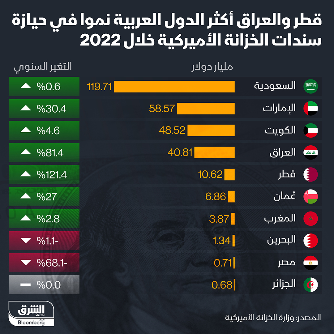 حيازة الدول العربية لسندات الخزانة الأميركية زادت 16% خلال 2022 لتسجل 291.7 مليار دولار.. وجاءت #قطر و #العراق في صدارة الدول العربية الأسرع نموا في حيازة هذه السندات خلال العام الماضي.
