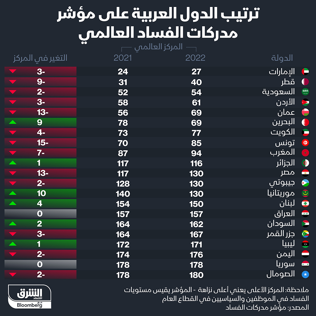 منظمة الشفافية الدولية أصدرت مؤشر مدركات الفساد لعام 2022، الذي يصنف 180 دولة ومنطقة حول العالم من خلال المستويات المتصورة لفساد القطاع العام.. فكيف صنفت الدول العربية ؟