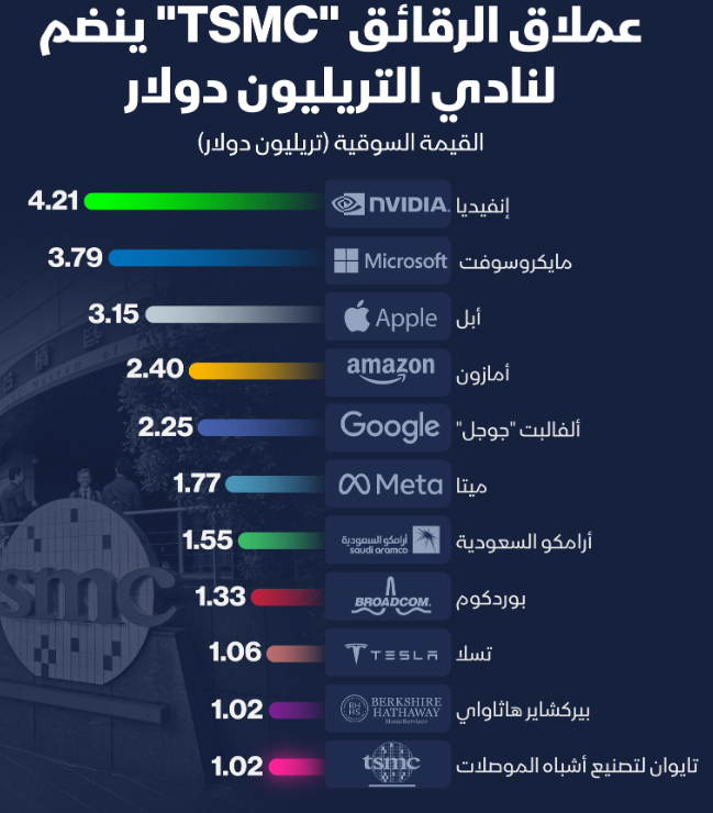 بعد انضمام صانعة الرقائق "TSMC" التايوانية.. تعرف على 11 شركة حول العالم قيمتها السوقية تتخطى "تريليون دولار" .