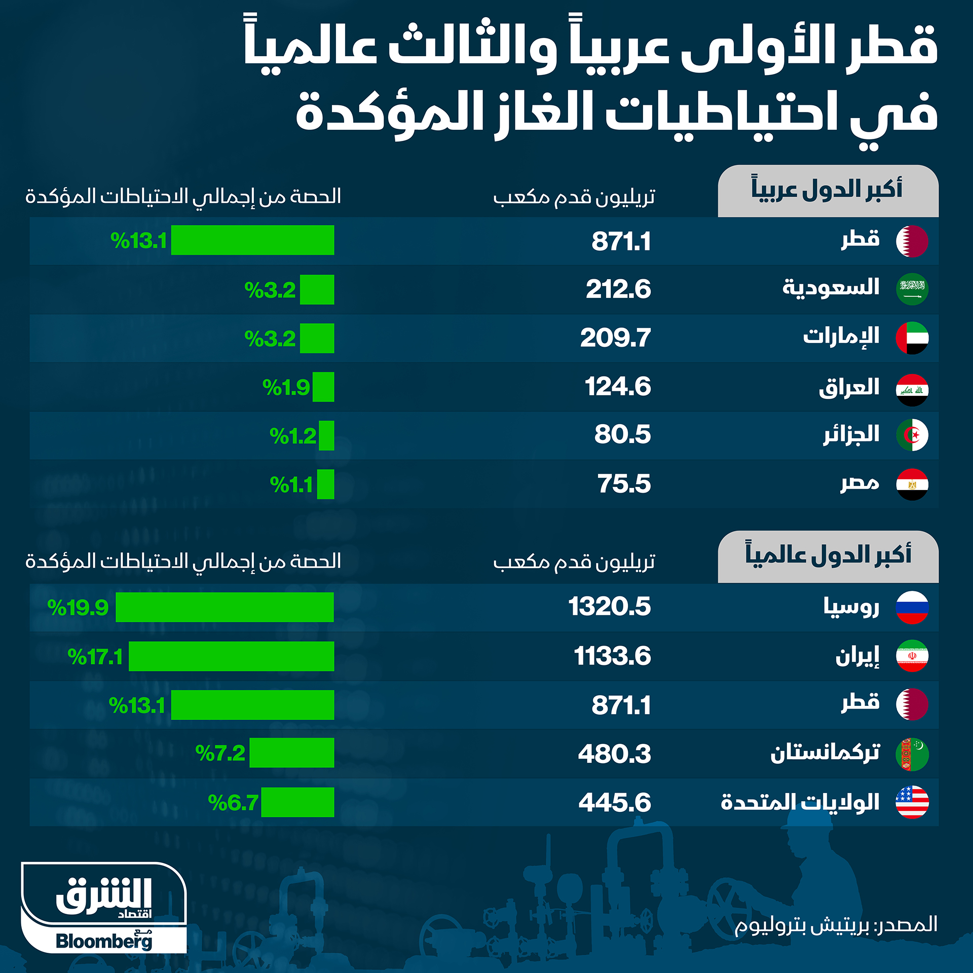 تستحوذ كلا من #روسيا و #إيران و #قطر على 50% من احتياطيات الغاز المؤكدة عالمياً .