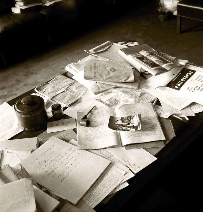 أوراق ألبرت أينشتاين وغليونه ومنفضة سجائر ومتعلقاته الشخصية الأخرى على طاولته -- تمامًا كما تركها الفيزيائي الحائز على جائزة نوبل - التقطت بعد ساعات فقط من وفاته، برينستون، نيوجيرسي، 18 أبريل 1955.