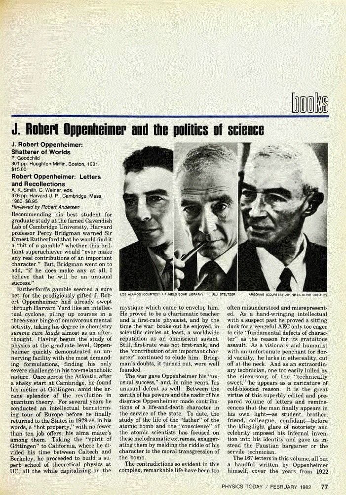 ظهرت مقالة عن أوبنهايمر في مجلة الفيزياء اليوم في فبراير 1982.